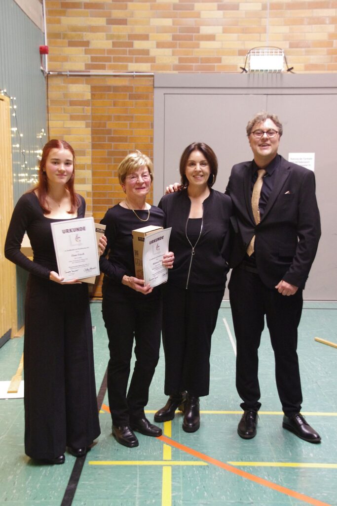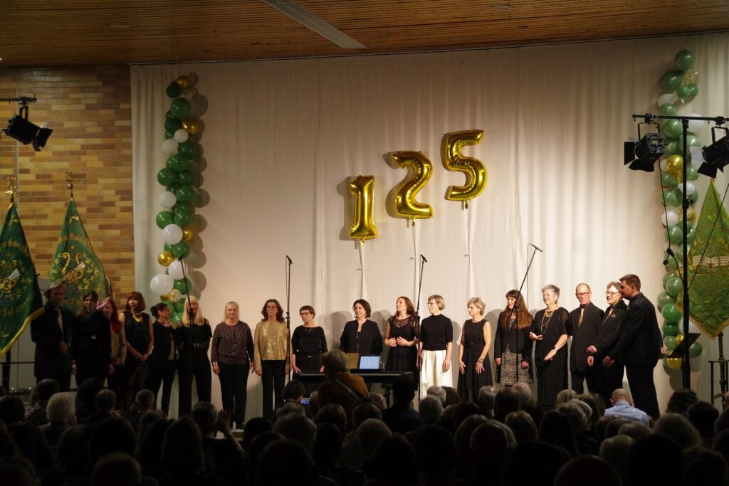 Teil der Jubiläumsgala waren auch die Ehrungen des Jahres 2025, die in einem würdevollen Rahmen der 1. Vorständin Sandra Sauer und dem 2. Vorstand Jakob Ullrich vorgenommen wurden. Anwesend zur Ehrung war Helmtrud Hein, die für sagenhafte 40 Jahre aktive Mitgliedschaft geehrt wurde, sowie Elena Czisch, die in ihrem jungen Alter bereits auf 10 Jahre aktive Mitgliedschaft zurückschauen konnte. Weiterhin wurden Erika Bernhard und Dr. Andreas Steinbacher für 25 Jahre, als auch Helga Dörflinger für 40 Jahre passive Mitgliedschaft geehrt. Toni Sauer wurde für erstaunliche 65 Jahre passive Mitgliedschaft geehrt, eine dankenswerte Unterstützung der Chorgemeinschaft. Die nichtanwesenden Mitglieder wurden im Nachhinein von Susanne Albert persönlich besucht und geehrt. Im zweiten Teil des Konzerts hatten die Generations ihren großen Auftritt. Mit dem Chorleiterwechsel zu Alexey Gubin hatte man sich neu sortiert und das Repertoire hin zu mehr poppigen und jazzigen Stücken verändert. Nach einigen ruhigen Stücken wie „Übern See“ und „Come in and stay a while“ ließ sich das Publikum bei Popsongs wie „Believer“ und „You´re the voice“ zu Standing Ovations hinreißen. Der Abend klang gut gelaunt im festlich geschmückten „Glaskasten“ der Turnhalle aus, die Sänger und Sängerinnen feierten ebenfalls ihre Erfolge bei einem Gläschen Wein. Die Chorgemeinschaft bedankt sich bei allen Helfern, Mitwirkenden, Rednern und Gästen für den gelungenen Abend.